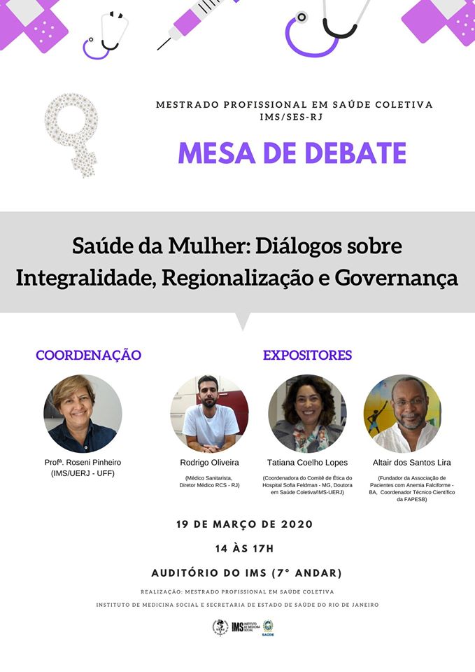 Dia 19/03 será realizada, pelo Mestrado Profissional em Saúde Coletiva do IMS/UERJ, a Mesa de Debate "Saúde da Mulher: Diálogos sobre Integralidade, Regionalização e Governança".